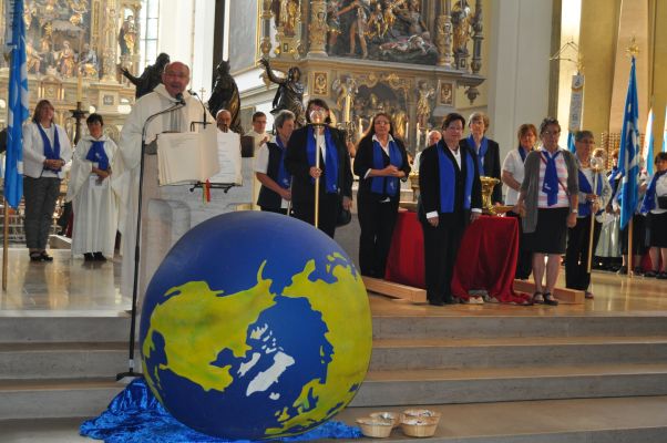 Weihbischof Wolfgang Bischof – der Beauftragte für Frauenfragen der bayrischen Bischofskonferenz - war im Jubiläumsjahr der Zelebrant des Jubiläumsgottesdienstes und bestärkte die Frauen in ihrem Friedensengagement. In seiner Predigt betonte er, dass es wie im Liedruf „Schweige und höre…“ angesichts der täglichen Nachrichten oft zuerst darum ginge zu Schweigen ohne vorschnell Antworten zu geben. Ein weiterer wichtiger Schritt sei das genaue Hören, was andere wirklich sagen und denken und dafür das eigene Herz zu öffnen. So entstehe gegenseitiges Verständnis und dies bringe uns dem Frieden näher. Um in dieser Haltung zu wachsen, sei es lebensnotwendig im Hören des Wortes Gottes aufzutanken und sich gegenseitig in der Hoffnung und Liebe zu bestärken, wie Christus es vorgelebt habe.