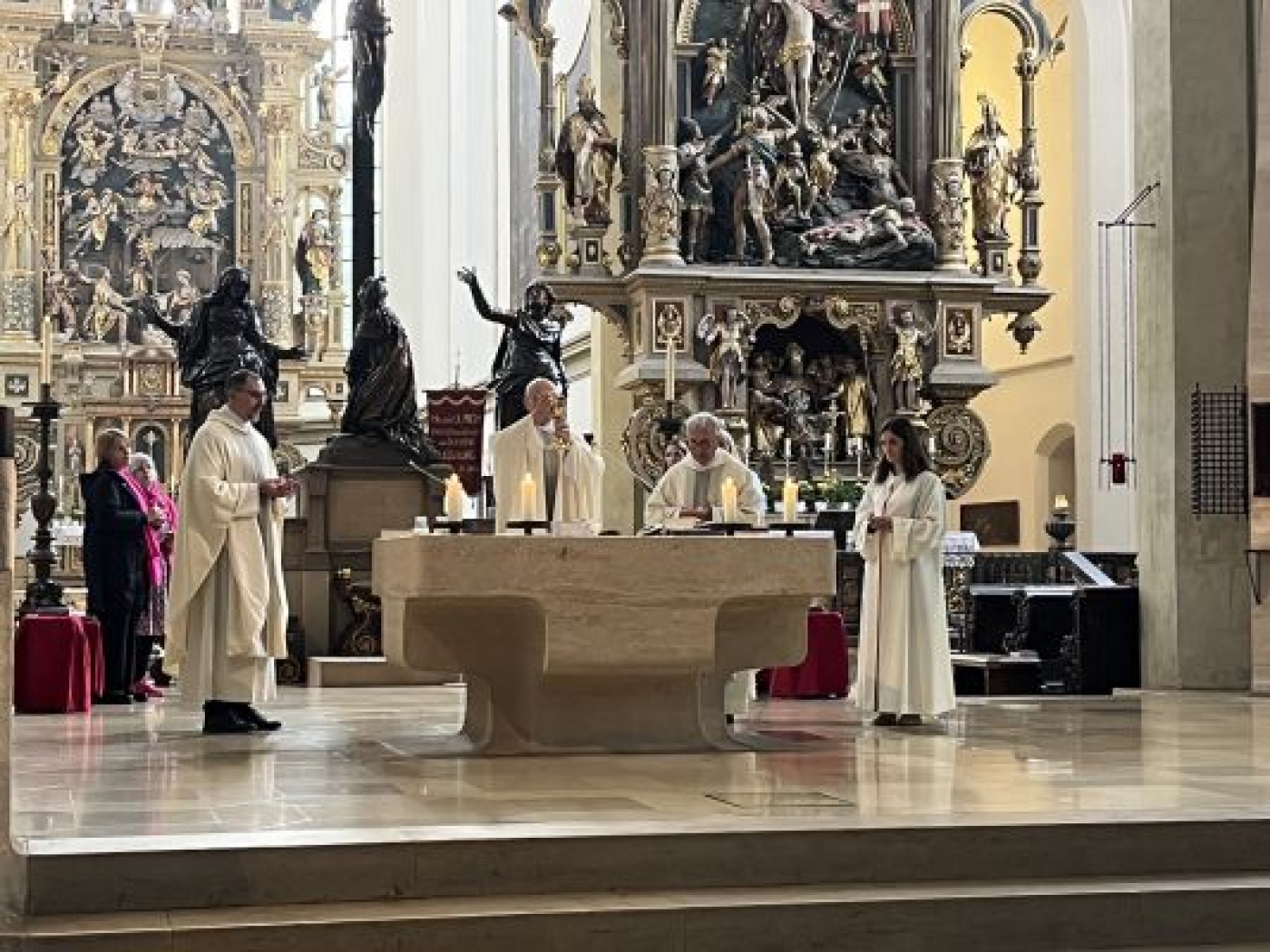 Der Tag startete mit einem Gottesdienst in der Ulrichsbasilika, den die geistliche Begleiterin des Diözesanverbandes, Ruth Hoffmann, unter das Thema „Sie haben die Wahl!“ stellte. In Liedtexten und Fürbitten wurde vor Gott getragen, was die Frauen beschäftigt, was diese Wahlmöglichkeiten bedeuten und wie jede einzelne mit ihren Gaben und Talenten einen lebendigen Beitrag zur Gemeinschaft leisten kann. Pfarrer Thomas Schwartz, der neun Jahre lang geistlicher Begleiter des Diözesanverbandes war, gab mit seiner letzten Predigt in dieser Funktion den Frauen richtungsweisende Worte mit auf den Weg: Die Aufgabe der Frauen in der Kirche bestehe nicht darin, im Hintergrund zu dienen, vielmehr sollen sie aktiv und sichtbar als Licht (das auch blenden kann) und Salz (das auch brennen kann) wirken. Schwartz ermutigte die Frauen, selbstbewusst für Gerechtigkeit, faire Strukturen und die Anerkennung ihrer Stimmen einzutreten, auch wenn das unbequem ist und stört. Ihre Aufgabe ist es, prophetisch zu handeln, die Kirche mit ihrer Kritik und ihren Visionen zu bereichern und den Geist Gottes lebendig zu halten, so dass Kirche wirklich das werden kann, wie es der Wahlspruch Leos XIV. formuliert: „In illo uno unum“ – in dem Einen eins.