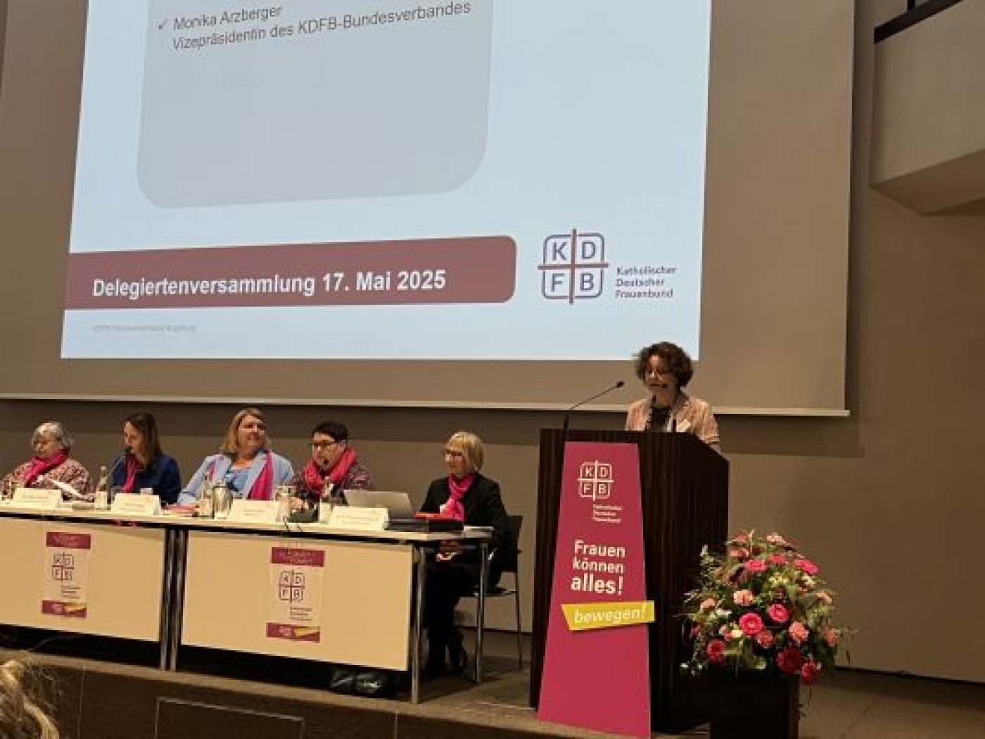 Mut und Entschlossenheit zeigen auch starke Frauen, die sich für ihre Rechte und die Rechte anderer einsetzen. In ihrem Vortrag verdeutlichte Prof.in Dr. Katrin Degen, dass diese Rechte heute mehr denn je in Gefahr sind. In den letzten Jahren ist der Einfluss extremistischer rechter Strömungen, verbunden mit antifeministischen Bewegungen, massiv gewachsen. Dabei ist zentral, dass die Idee der Geschlechterungleichheit oft mit weiteren Ideologien wie Rassismus oder Antisemitismus verknüpft ist. Angesichts des aktuellen Höhenflugs der AfD ist zu erwarten, dass diese Einstellungen wieder an gesellschaftlicher Bedeutung gewinnen. Fortschritte bei der Geschlechtergerechtigkeit sowie bei der Akzeptanz vielfältiger Lebens- und Familienformen werden dadurch zunehmend zurückgedrängt. Bemerkenswert ist, dass sich die Themen rund um Antifeminismus seit über 100 Jahren kaum verändert haben: Es geht immer um die Einschränkung der gleichwertigen Mitbestimmung, die Verhinderung oder Erschwerung von Lohnarbeit sowie die Kontrolle über die geschlechtliche Selbstbestimmung. Es ist daher wichtiger denn je, aktiv für Frauenrechte einzutreten. Hier ist der KDFB ein wichtiger Partner. Sein Wertefundament aber auch sein großes Netzwerk an engagierten Frauen setzt sich ein für starke politische Teilhabe. So stellte die stellvertretende Landesvorsitzende Sabine Slawik den Anwesenden eine neue Aktion vor: Mit der Kampagne „Starke Frauen – Starke Demokratie“ und einer begleitenden Website zur Kommunalwahl 2026 wird faktenbasiertes politisches Engagement aktiv unterstützt. Umfassende Forderungen zur Prävention und Bekämpfung geschlechtsspezifischer Gewalt sowie zur Stärkung der Rechte von Frauen werden an die Politik gerichtet. Deutlich wird vom KDFB-Vorstand hervorgehoben, dass eine AfD-Mitgliedschaft grundsätzlich unvereinbar ist mit einer Mitgliedschaft im KDFB.