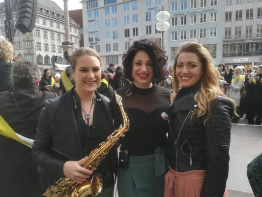 Dann kam Bewegung auf den Marienplatz: Sarah Kaspar und zwei weitere Musikerinnen performten den Women-Power-Song und der starke Refrain schallte lautstark über den Marienplatz: